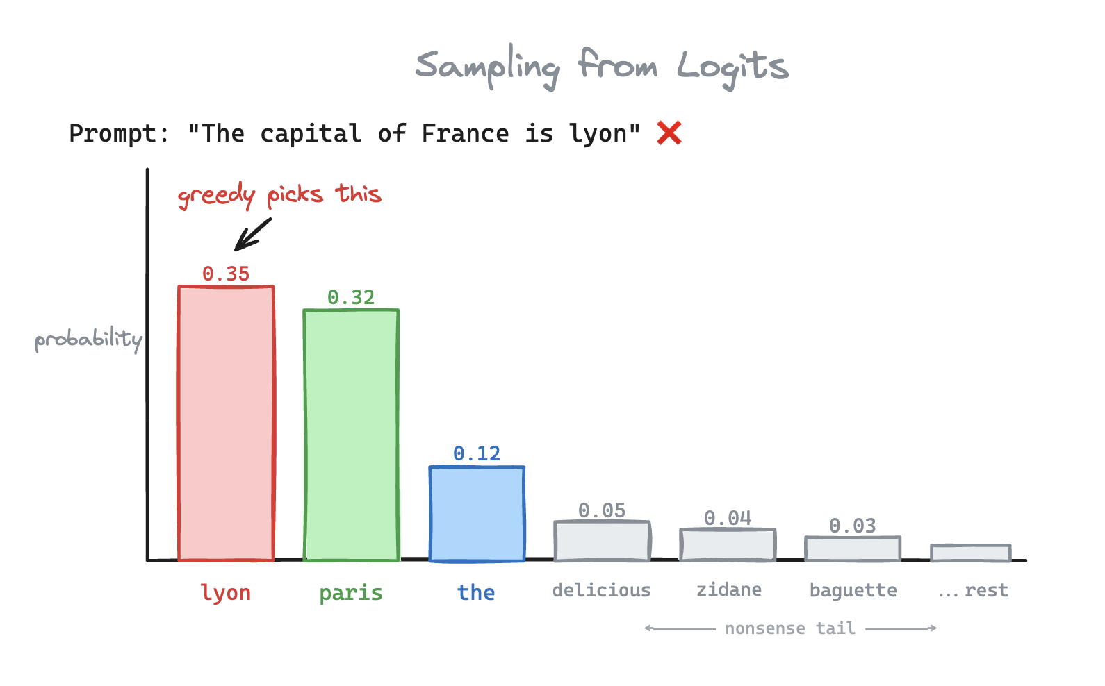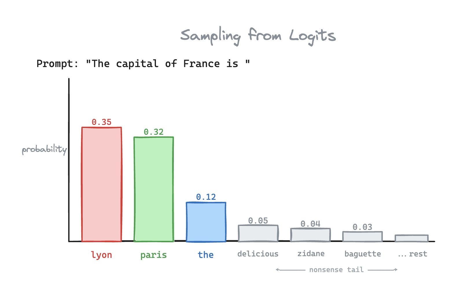 Okay, so greedy is out. What if we pick each token according to its probability? Paris has a 32% chance, Lyon has a ~35% chance, and remaining tokens have a 33% chance.