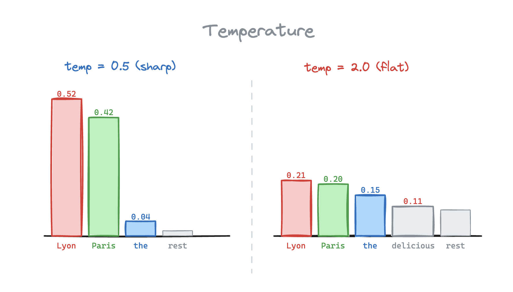 Top-k keeps the highest probability tokens and zeros out the rest. With , only Lyon and Paris survive.